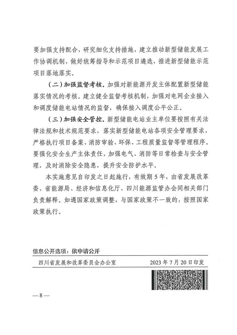 9月11日,四川省發(fā)改委、四川省能源局、四川省經(jīng)濟(jì)和信息化廳、國(guó)家能源局四川監(jiān)管辦公室聯(lián)合印發(fā)了《關(guān)于加快推動(dòng)四川省新型儲(chǔ)能示范項(xiàng)目建設(shè)的實(shí)施意見(jiàn)》(以下簡(jiǎn)稱(chēng)《實(shí)施意見(jiàn)》),有效期5年。《實(shí)施意見(jiàn)》提出,優(yōu)選建設(shè)一批獨(dú)立新型儲(chǔ)能電站示范項(xiàng)目,力爭(zhēng)到2025年全省新型儲(chǔ)能規(guī)模達(dá)200萬(wàn)千瓦以上。 重點(diǎn)任務(wù): 1.推進(jìn)獨(dú)立開(kāi)發(fā)新能源項(xiàng)目配置新型儲(chǔ)能。要求為不低于裝機(jī)容量10%,時(shí)長(zhǎng)2小時(shí)以上。 2.鼓勵(lì)多能互補(bǔ)開(kāi)發(fā)新能源項(xiàng)目配置新型儲(chǔ)能。對(duì)納入金沙江上游、金沙江下游、雅礱江流域、大渡河中上游等水風(fēng)光一體化可再生能源綜合開(kāi)發(fā)基地的新能源項(xiàng)目,鼓勵(lì)結(jié)合消納情況配置新型儲(chǔ)能。 3.有序推進(jìn)儲(chǔ)能試點(diǎn)示范。支持各類(lèi)主體優(yōu)先再省內(nèi)負(fù)荷中心建設(shè)獨(dú)立新型儲(chǔ)能電站,推動(dòng)新型儲(chǔ)能多元化/產(chǎn)業(yè)化/市場(chǎng)化發(fā)展。獨(dú)立儲(chǔ)能示范項(xiàng)目應(yīng)集中建設(shè),單座電站裝機(jī)容量原則上不低于10萬(wàn)千瓦。 支持政策: 1.明確獨(dú)立新型儲(chǔ)能市場(chǎng)主體地位。符合條件和標(biāo)準(zhǔn)的,具有法人資格的新型儲(chǔ)能項(xiàng)目可轉(zhuǎn)為獨(dú)立新型儲(chǔ)能,作為獨(dú)立主體參與電力市場(chǎng)。鼓勵(lì)以配建形式存在的新型儲(chǔ)能項(xiàng)目,可選擇轉(zhuǎn)為獨(dú)立新型儲(chǔ)能項(xiàng)目。風(fēng)光水火儲(chǔ)多能互補(bǔ)一體化項(xiàng)目的儲(chǔ)能,原則上暫不轉(zhuǎn)為獨(dú)立新型儲(chǔ)能。 2.支持獨(dú)立新型儲(chǔ)能參與市場(chǎng)交易。進(jìn)入電力現(xiàn)貨市場(chǎng)前,儲(chǔ)能電站作為獨(dú)立市場(chǎng)主體參與市場(chǎng)中長(zhǎng)期交易。充電時(shí),可作為電力市場(chǎng)用戶(hù)享受分時(shí)電價(jià)政策;放電時(shí),參加火電市場(chǎng)化交易,價(jià)格由市場(chǎng)形成。 獨(dú)立新型儲(chǔ)能電站向電網(wǎng)送電的,其相應(yīng)充電電量不承擔(dān)輸配電價(jià)和政府性基金及附加,充放電損耗電費(fèi)由獨(dú)立新型儲(chǔ)能電站承擔(dān)。 進(jìn)入電力現(xiàn)貨市場(chǎng)后,獨(dú)立新型儲(chǔ)能電站用電電價(jià)、上網(wǎng)電價(jià)按照現(xiàn)貨市場(chǎng)價(jià)格及規(guī)則結(jié)算。 3.建立獨(dú)立新型儲(chǔ)能容量共享租賃機(jī)制。建議參考區(qū)間為200-400元/千瓦年。鼓勵(lì)新能源開(kāi)發(fā)企業(yè)和獨(dú)立儲(chǔ)能新型儲(chǔ)能項(xiàng)目業(yè)主單位簽訂長(zhǎng)期租賃協(xié)議合同。 4.支持獨(dú)立新型儲(chǔ)能參與電力輔助服務(wù)。 5.支持獨(dú)立新型儲(chǔ)能電站并網(wǎng)調(diào)用。電網(wǎng)企業(yè)應(yīng)與獨(dú)立新型儲(chǔ)能電站業(yè)主簽訂并網(wǎng)調(diào)度協(xié)議,同等條件下優(yōu)先調(diào)用。原則上每年調(diào)用完全充放電次數(shù)不低于250次。 原文如下: | ||||